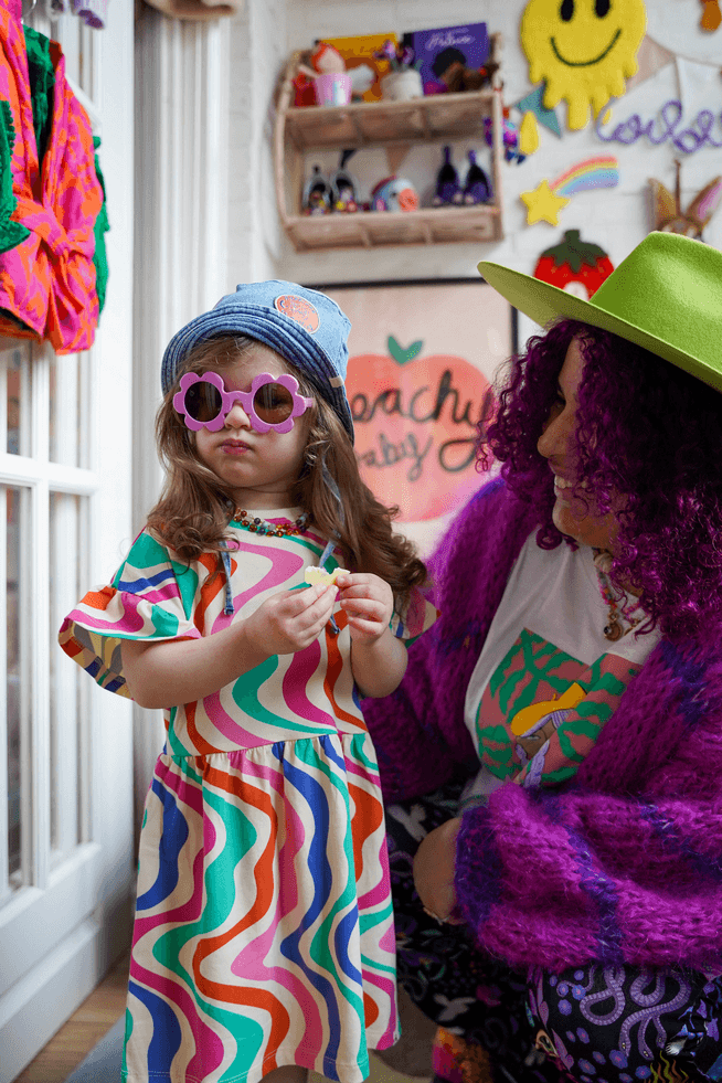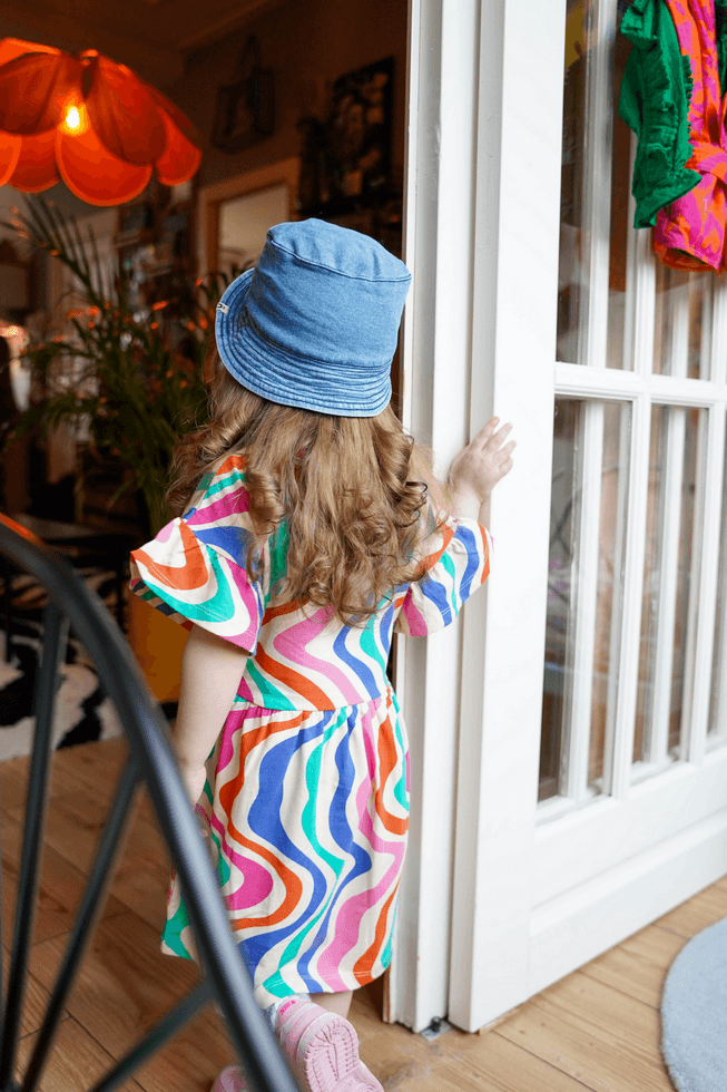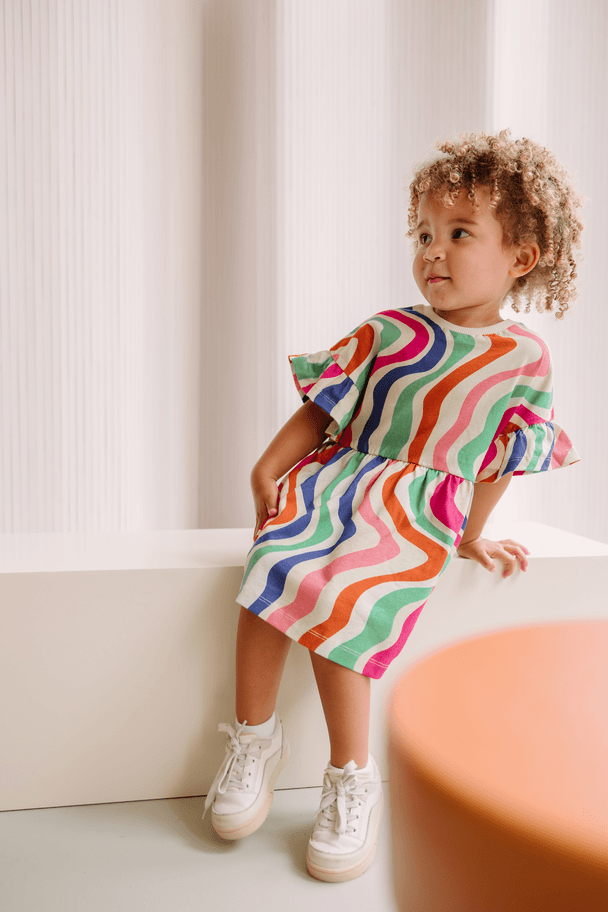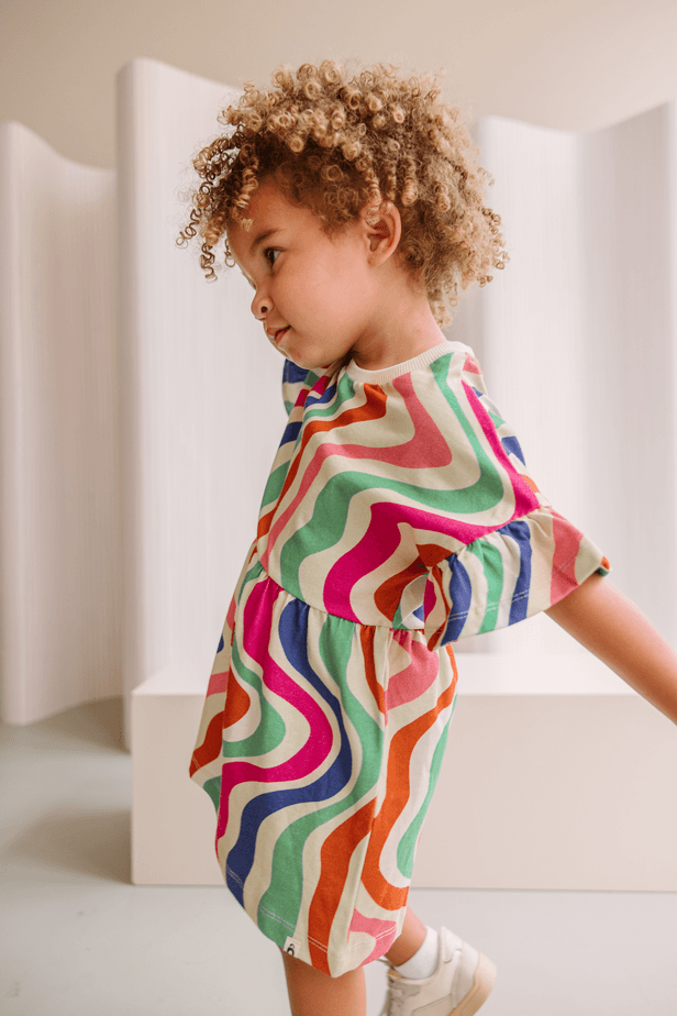 Wij gaan geen kleur en print uit de weg! Zo ook niet voor deze vrolijke Cato jurk. De kleurrijke groovy print maakt deze jurk echt uniek. Dit model valt wat ruimer en is afgewerkt met een toffe roezels. Gemaakt van duurzaam katoen.